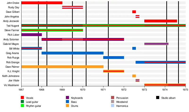 Past members | Ted Nugent Dave Palmer Steve Farmer John Drake Rick Lober Bill White Greg Arama Andy Solomon Rusty Day K.J. Knight Rob Ruzga Rob Grange Andy Jezowski Vic Mastrianni Gabriel Magno Butch Giese |