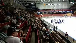 The arena hosted games during the 2007 World Junior Ice Hockey Championships, together with FM Mattsson Arena in Mora. The following season, the 2007 4 Nations Cup was played at Tegera Arena. The current attendance record for ice hockey is 8,017.[4] However, the maximum capacity has since been reduced to 7,650 due to safety regulations. Until fall 2010 the name was Ejendals Arena, but the company owning the name rights decided they wanted to promote a brand instead of their company name.[5]