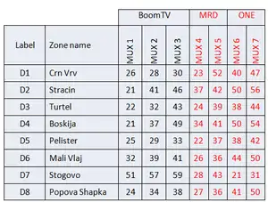 DVB-T was introduced in Republic of North Macedonia in November, 2009 as a Pay TV platform known as BoomTV by ONE. The platform includes national channels with national frequency and the most popular world channels. Boom TV is using 3 multiplexes (MUX 1, MUX 2 and MUX 3). The DVB-T switch off in the country was completed on 1 June 2013. MRD (Republic of Macedonia Broadcasting Council) operates and maintains the DVB-T network in the Republic of North Macedonia and the public Macedonian Radio Television using MUX 4 and MUX 5 while ONE operates the private national and local TV stations in North Macedonia using MUX 6 and MUX 7.