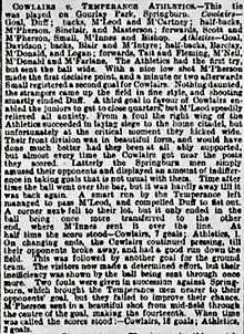 Despite a run of unimpressive results in 1887–88 (its only win of any note being 2–1 at Carlton in February[5]), the club turned senior in August,[6] and entered the 1888–89 Scottish Cup and Glasgow Cup. The club may have been hoping to spread the message that teetotalism was not an impediment to athletic performance, given attempts to set up Temperance Athletic clubs by its Glaswegian members elsewhere in Scotland.[7] However, as far as the Scottish Cup was concerned, the message backfired, as neighbours Cowlairs inflicted on the club the biggest defeat of the first round, by a score of 18 goals to 2.[8] A fortnight later the club recovered enough to lose only 3–2 against Southern Athletic,[9] the outcome perhaps tempered by it being the visitors' only ever competitive victory.