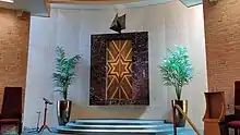 The building includes a main sanctuary, a fellowship hall (which can be also used as overflow seating for high holiday services), classrooms, offices, a library, a gym and a smaller chapel. Art and other visual displays are scattered throughout the building.[36][37] The building is located on a 8.77 acre campus with a pool and a playground.[38]