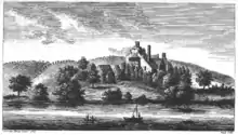 When the Knights Templar were suppressed in 1312 all their assets passed to the Knights Hospitaller, including Temple Manor.[2] Around this time the building was extended to the north with a ground-floor hall roughly 14 feet (4.3 m) wide.[1] Many of the scattered farm buildings were cleared between 1308–1344 and evidence from archaeology indicates relatively little disturbance during the suppression of the Templars.[1] It is thought therefore that the manor had already become simply a farm to generate rent money for its owner.[1] It is possible that the tenants were the Creyes, known to be the wealthiest family in Strood but who held not feudal lands.[6] An inventory of Templar estates in 1313 lists a hall, a chamber, a chapel and a barn as being at Strood.[7] Some years after the suppression of the Templars, the Grand Prior of the Hospitallers complained that the king was still occupying ex-Templar lands at Denny, Cambridgeshire and Strood. The complaint was to no avail and in 1324 the lands were ceded to the King.[1] In 1342 Edward III granted it to Mary of St Pol, Countess of Pembroke who in turn granted it to her nunnery at Denny Cambridgeshire.[2] Given the lack of transport at the time, it could not have been used to supply the nunnery with goods, and so must have simply been a source of revenue.[8]