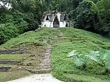 The Temple of the Cross Complex is a complex of temples at the Maya site of Palenque in the state of Chiapas in Mexico. It is located in the south-east corner of the site and consists of three main structures: the Temple of the Cross, Temple of the Sun, and the Temple of the Foliated Cross. The Temple of the Cross is the largest and most significant. The temple is a step pyramid containing bas-relief carvings inside. The temple was constructed to commemorate the rise of Chan Bahlum II to the throne after the death of Pacal the Great. The bas-relief carvings reveal Chan Bahlum receiving the great gift from his predecessor. The cross motif found at the complex allude to the names given to the temples, but in reality the cross is a representation to the World Tree that can be found in the center of the world according to Mayan mythology.[1]