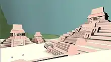 The Temple of the Foliated Cross is directly across the courtyard from the Temple of the Sun, and both are adjacent to the Temple of the Cross. Temple XIV and Temple XV are two smaller temples are found between the Temple of the Sun and the Temple of the Cross. The picture to the left is a reconstruction as seen from the Temple of the Foliated Cross, although Temple XV is missing from the illustration.[6]