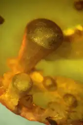 Club-shaped structures rimming mid-Cretaceous Burmese amber were formerly identified as the fungal sporocarps Palaeoclavaria burmitis. a 2018 study re-identified the structures as domichnia (crypts) bored in the amber nodules by bivalves of the pholadid subfamily Martesiinae. The borings are comparable with Teredolites clavatus and Gastrochaenolites lapidicus .[1] Due to the substrate of the Myanmar borings being amber, the term Amberground was coined.