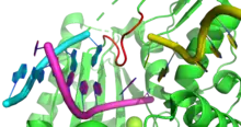 Terminal deoxynucleotidyl transferase (TdT), also known as DNA nucleotidylexotransferase (DNTT) or terminal transferase, is a specialized DNA polymerase expressed in immature, pre-B, pre-T lymphoid cells, and acute lymphoblastic leukemia/lymphoma cells. TdT adds N-nucleotides to the V, D, and J exons of the TCR and BCR genes during antibody gene recombination, enabling the phenomenon of junctional diversity. In humans, terminal transferase is encoded by the DNTT gene.[5][6] As a member of the X family of DNA polymerase enzymes, it works in conjunction with polymerase λ and polymerase μ, both of which belong to the same X family of polymerase enzymes. The diversity introduced by TdT has played an important role in the evolution of the vertebrate immune system, significantly increasing the variety of antigen receptors that a cell is equipped with to fight pathogens. Studies using TdT knockout mice have found drastic reductions (10-fold) in T-cell receptor (TCR) diversity compared with that of normal, or wild-type, systems. The greater diversity of TCRs that an organism is equipped with leads to greater resistance to infection.[7][8] Although TdT was one of the first DNA polymerases identified in mammals in 1960,[9] it remains one of the least understood of all DNA polymerases.[7] In 2016–18, TdT was discovered to demonstrate in trans template dependant behaviour in addition to its more broadly known template independent behaviour[10][11]