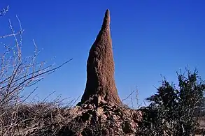 Termitomyces schimperi do not appear on all termite mounds.[5] They grow on tall termite mounds of central and northern parts of Namibia where a large rainfall occurs, and can often extend to 4-5 m in height. Their tops inclinetowards the north. The associated termite is the Termes bellicosus also known as Macrotermes michaelseni. In Zambia the Termitomyces schimperi is found at the termite mounds of Odontotermes patruus.[5]