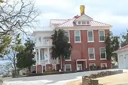 It is a three-story building upon a full basement and is constructed of mitered red brick from Coffeyville, Kansas. It has a hipped roof broken by three pedimented dormers and two main chimneys. The front center of the building has six two-story hollow wood Corinthian columns supporting an entablature, with a balcony with balustrade at its second floor level. The central porch is flanked by almost-circular porches two stories tall running from basement level through first floor level.[2]