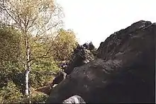 The Teufelsmauer (Devil's Wall) is a rock formation made of hard sandstones of the Upper Cretaceous in the northern part of the Harz Foreland in central Germany. This wall of rock runs from Blankenburg (Harz) via Weddersleben and Rieder to Ballenstedt. The most prominent individual rocks of the Teufelsmauer have their own names. The Teufelsmauer near Weddersleben is also called the Adlersklippen ("Eagle Crags").