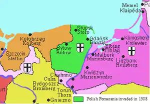 The Margraviate of Brandenburg entered the scene after Mestwin II, son of Swietopolk, concluded the Treaty of Arnswalde with them, in order to receive aid against his brother, Wartislaw.[6] The margraves took over the town in 1270/1 from Wartislaw, but did not hand it over to Mestwin until the latter was able to force them out by concluding an alliance with Boleslaw Pobozny, duke of Greater Poland.[6] Under the rule of Brandenburg, conflicts erupted between the Slavic and German populations, which cost many lives.[6] In the 1282 Treaty of Kępno[7] Mestwin II promised his Pomerelian duchy to his ally Przemysł II, duke and later king of Poland, who succeeded to the duchy after Mestwin's death in 1294.[8]