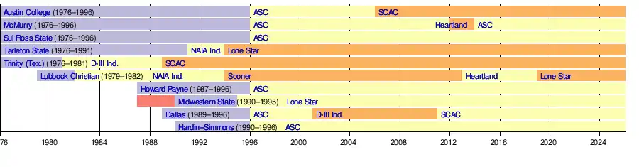 - ↑ Midwestern State joined the TIAA as an associate member for football from the 1987 to 1989 fall seasons (1987–88 to 1989–90 school years).