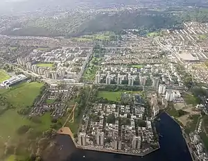 Much of Thamesmead was initially built by the Greater London Council (GLC) for rent to families moving from overcrowded back-to-back Victorian housing (also referred to as slums) in south eastern parts of Inner London. The area had been inundated in the Flood of 1953, so the original design placed living accommodation at first floor level or above, used overhead walkways and left the ground level of buildings as garage space.[6] There is also an elevated 'escape route' from the estate to be used in the event of flooding, which runs along the top of a grassed mound to the north of Lesnes neighbourhood.