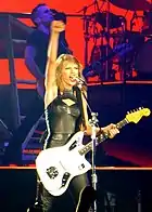 The concert begins with black-and-white projections of street scenes, which subsequently serves as the backdrop to the performance of "Welcome to New York".[17] Swift then emerges from beneath the stage to sing the song, followed by "New Romantics" surrounded by a dozen male dancers.[17][18] Next, Swift sings "Blank Space" before erupting into a call-and-response climax where she strikes a golf club against a black lacquer cane whilst also shouting the name of the city where the concert is being held.[19][20][21] Swift proceeds with an industrial rock-oriented version of "I Knew You Were Trouble", which she performs as shirtless male dancers delivered a sensual choreography.[19][20][22]