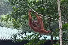 For their Speed Bump, Alli & Angie had to create a climbing rope for the orangutans. They had to use a slingshot to launch a line over a branch, secure a thicker rope and pull the rope over the branch before they could continue racing.
