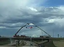 In this leg's first Roadblock, one team member had to climb down a cargo net suspended from the pedestrian bridge over Montmorency Falls in order to retrieve their next clue, and then climb back up to reunite with their partner.
