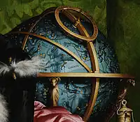 Scholars have often argued that the celestial globe is placed to indicate a particular time and date, which may help understand some of the hidden meanings in the painting. However, an alternative explanation is that the horizon ring is set to 42º N, 48º from the equator, being the latitude for Rome as understood by contemporaries. It "reflects a sky over Rome", rather than a particular date for the figures' meeting in London. This could be interpreted as an allusion to the Vatican and the "primacy of the Catholic church". Alternatively, the latitude may have been incorrectly set to indicate 48º N (rather than 48º from the equator), which would indicate Paris or Polisy.[39]