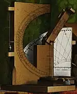The horary quadrant was identified by P. Drinkwater in 1993 as being a straight lined horarium bilimbatum, presented in a disassembled state.[47][48] Dekker and Lippincott reject North's suggestion that it is a meteoroscope, for trigonometric calculations, on the grounds that it has sights, so must be for observation, rather than a calculation device.[49] A very similar device is sketched in Kratzer's papers, now at Oxford.[50] It is presented lying on its side, with its sights in the wrong place for use, so should be seen as a device at rest. Given the limited detail in the painting, it is not possible to know what at what latitude the quadrant would have been designed to be used.[51]