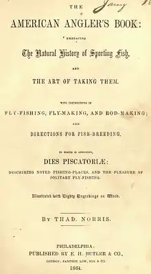 The American Angler's Book Embracing the Natural History of Sporting Fish and the Art of Taking Them with Instructions in Fly-Fishing, Fly-Making, and Rod-Making and Directions for Fish-Breeding, to which is appended Dies Piscatoriae Describing Noted Fishing-Places, and The Pleasure of Solitary Fly-Fishing is an early American angling book by Thaddeus Norris (1811-1877) first published in 1864. Norris was known as Uncle Thad and commonly referred to in American angling history as "The American Walton".[1]