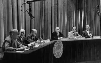 The American Forum of the Air, hosted by Theodore "Ted" Granik (1907–1970), is a public affairs panel discussion program, the first series of its kind on radio.[1] It aired on the Mutual Broadcasting System and NBC from 1934 to 1956. Notable guests, such as Franklin D. Roosevelt (before he was president), journalist Dorothy Thompson, New York mayor Fiorello H. La Guardia, U.S. Senators Harry Truman and Robert A. Taft, discussed a wide range of topics, from the New Deal to fascism.[2] The series won a Peabody Award in 1940.