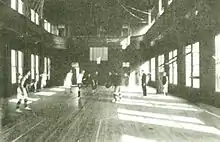 Angier B. Duke Gymnasium was constructed in 1898, funded by a donation from Benjamin N. Duke, who named it for his son, Angier.[3] The gym served as the host for the second college basketball game in the State of North Carolina on March 2, 1906, with Wake Forest defeating Trinity by a score of 24–10. The playing surface measured just 50' x 32',[2] much smaller than a modern court, which measures 94' x 50'. After the basketball team moved, the building was used in varying capacities over the next several decades, including as a laundry facility, a recreation center, and a coffeehouse/nightclub, before settling into its current use as a dance studio.[4]