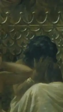 Imogen Hart points out that Herodotus describes the event taking place in the heart of a village, not an auction house, with the men of the village standing in a circle around the women, not a line.[25] She further observes that Long's painting however, is set in a building reminiscent of a modern auction house, the men gathering in a line, not a circle. Bohrer attributes this divergence of Herodotus' translation to Long's own artistic freedom or reimagining of the fable,[11] purposely abstracting the content of Herodotus to be more resonant with his 1875 audience. Hart attributes this divergence with Herodotus to Long's reading and favour for George Swayne's translation and commentary on Herodotus,[25][26] which contains this linear arrangement and equal arrangement of the brides as depicted by Long.[26] The Graphic notes Long's fondness for Swayne's commentary on Herodotus.[3] It is argued that Long chose this method of composition because it better aligns the women (brides) with the decimal currency, with Hart arguing that the linear arrangement is more like a numerical scale that converts the brides to numerals.[27] She posits that a core feature of the painting is Long's purposeful obscuring of the faces of the ugliest and most beautiful brides.[27] By doing this Long is argued to address the philosophical problem of the difficulty or impossibility of assigning an objective worth to beauty.[28][18][27] Long was understood to put forward that the most beautiful and ugly things are deeply subjective and personal.[27] The additional choice to have the women seated at an equal level has been observed to establish an impactful linear equality, not hierarchy; Hart argues that this feature of the women's seating is key to understanding Long's critique of the Babylonian ritual.[27] The first bride is facing away from the viewer in the detail, and in doing so the viewer is not able to see her face, but can see the linear equality of the bride's seating positions.