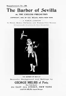 The Barber of Seville (French: Le Barbier de Séville),[3] also released as The Barber of Sevilla, or the Useless Precaution,[2] was a 1904 French silent film directed by Georges Méliès, based on the 1775 play of the same name by Pierre Beaumarchais.[1] It was released by Méliès's Star Film Company and is numbered 606–625 in its catalogues,[2] where it was advertised as a comédie burlesque en 7 actes, d'après Beaumarchais.[4] Like several other of Méliès's longer films, two versions were released simultaneously: a complete 22-minute print and an abridged print.[1]
