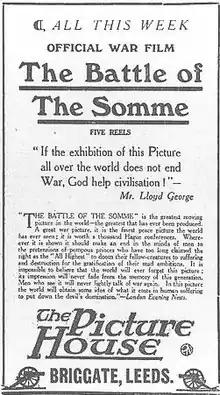 Some members of the audience considered it immoral to portray scenes of violence; Hensley Henson, the Dean of Durham, protested "against an entertainment which wounds the heart and violates the very sanctity of bereavement". Others complained that such a serious film shared the cinema programme with comedy films.[25] On 28 August, the Yorkshire Evening Post printed the comment, attributed to Lloyd George, "If the exhibition of this Picture all over the world does not end War, God help civilisation".[26] The film was shown to British troops in France from 5 September; Lieutenant-Colonel Rowland Feilding, an officer who saw the film in a muddy field near Morlancourt, described it as "a wonderful and most realistic production" but criticised the film for failing to record the sound of rifles and machine-guns, although there was an artillery accompaniment from guns firing nearby.[5] Feilding suggested that the film could reassure new recruits, by giving them some idea of what to expect in battle; the intertitles were forthright, describing images of injury and death.[27]