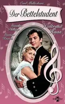 The Beggar Student is a 1956 (German: Der Bettelstudent) West German musical film directed by Werner Jacobs and starring Gerhard Riedmann, Waltraut Haas and Elma Karlowa.[1] It is based on the operetta Der Bettelstudent by Karl Millöcker, and is part of the operetta film tradition. It was shot at the Bavaria Studios and the Carlton Studios in Munich. The film's sets were designed by the art director Felix Smetana.