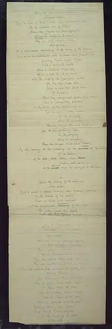 The sounds of the verses, specifically the repetitive "bells, bells, bells, bells, bells, bells, bells", lie on a narrow line between sense and nonsense, causing a feeling of instability.[2] Poe uses – and popularised – the word "tintinnabulation", often wrongly thought to be his own coinage,[3] based on the Latin word for "bell", tintinnabulum.[4] The series of "bells" echo the imagined sounds of the various bells, from the silver bells following the klip-klop of the horses, to the "dong, ding-dong" of the swinging golden and iron bells, to screeching "whee-aaah" of the brazen bells. The series are always four, followed by three, always beginning and ending on a stressed syllable. The meter changes to iambic in the lines with repeated "bells", bringing the reader into their rhythm. Most of the poem is a more hurried trochaic tetrameter.[5]