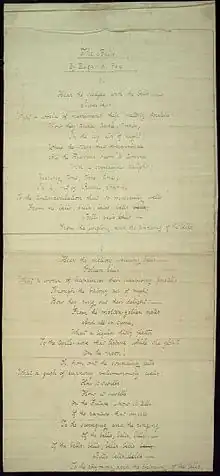 Inspiration for the poem is often granted to Marie Louise Shew, a woman who had helped care for Poe's wife Virginia as she lay dying.[12] One day, as Shew was visiting Poe at his cottage in Fordham, New York, Poe needed to write a poem but had no inspiration. Shew allegedly heard ringing bells from afar and playfully suggested to start there, possibly even writing the first line of each stanza.[14]