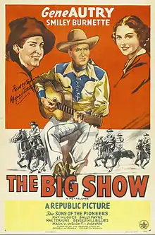 The Big Show is a 1936 American Western musical film directed by Mack V. Wright and starring Gene Autry, Kay Hughes, and Smiley Burnette. Written by Dorrell and Stuart E. McGowan, the film is about a singing cowboy who confuses two girls by being himself and his own stunt double at the Texas Centennial in Dallas. Roy Rogers appears in the film as one of the Sons of the Pioneers.[1]