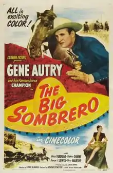 The Big Sombrero is a 1949 American Western film directed by Frank McDonald and starring Gene Autry and Champion. Written by Olive Cooper, the film is about a singing cowboy hired as foreman of the Big Sombrero ranch by a man working against the interests of the ranch's absentee owner and workers.[1]