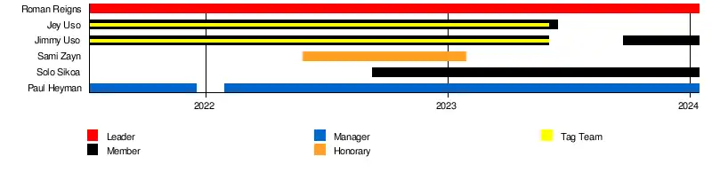 Members | Roman Reigns (leader) Jimmy Uso Solo Sikoa Paul Heyman (manager) |