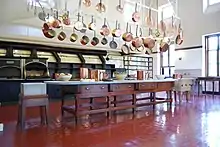 - Kitchen – The kitchen, unlike others in the time period, was situated on the first floor away from the main house to prevent the possibility of fires and cooking smells reaching the main parts of the house. The well-ventilated room supports a 21 ft (6.4 m) cast iron stove, which heats up as a single element through a coal burning stove. The work table is made of zinc, a metal which served as the forerunner to stainless steel; in front of it is a marble mortar used to crush various ingredients. Ice cut in winter from the local ponds kept the side rooms cool where food was stored, and facilitated a colder room for the assembling of confections.[12] The kitchen and baking pantry each have one dumbwaiter that travels to the basement level where groceries were delivered and refuse removed.