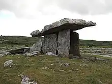 The Burren (/ˈbʌrən/ BURR-ən; Irish: Boirinn, meaning 'rocky district')[1] is a karst/glaciokarst landscape centred in County Clare, on the west coast of Ireland.[2] It measures around 530 square kilometres (200 sq mi), within the circle made by the villages of Lisdoonvarna, Corofin, Gort and Kinvara.[3] The area includes such natural features as Mullaghmore hill and Ailladie cliffs, and historic monuments such as Poulnabrone dolmen and Caherconnell Stone Fort. The Burren National Park covers a small part of the Burren and is the smallest of the six National Parks in Ireland, while the adjacent territory, including the Cliffs of Moher, is included in the Burren and Cliffs of Moher Geopark.