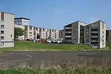The Calders contains the Wester Hailes Education Centre. The bulk of the housing stock is council owned, and the area contains some of the remaining high rises in Edinburgh (Cobbinshaw House, Dunsyre House and Medwin House, all 13-storey 'slab' blocks).[3][4][5] The majority of the other buildings are four storeys high (some in a tenement style with a common stairway serving two flats on each floor, others in cube-shaped structures with four flats on each floor off a central stairway, with a small percentage of two-storey tenements and some of the cubes built on a slope towards the canal featuring a fifth floor). All were built in the late 1960s and early 1970s to an angular design, primarily of grey concrete with dark brown features; before they were constructed, the area contained prewar prefabs.[6]