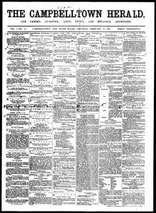 First published on 14 February 1880 by William Webb,[1] The Campbelltown Herald was published between 1880 and 1919. It was the first paper published in the Campbelltown area.[2] Early editions of the paper bore the banner title The Campbelltown Herald and Camden, Liverpool, Appin, Picton and Menangle Advertiser.[3] On 30 March 1898, the banner title of the paper carried the sub-heading "with which is incorporated The Campbelltown Liberal".[4]