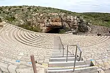 Built between 1963 and 1966, the amphitheater is made of limestone. It is about 100 feet (30 m) wide and made up of 22 rows of seating arranged in tiered arches and separated by a central aisle with a staircase. Overall, it drops down about 75 feet (23 m).
