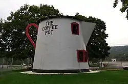 The Coffee Pot in Bedford, Pennsylvania is an example of novelty architecture. The lunch stand was built in the shape of a coffee pot by David Koontz in 1927. It was threatened with demolition in the 1990s, but in 2004 was moved across the street and restored.[2] It currently serves as a gift shop.[3]