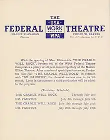 - 1 2 "'Cradle Will Rock' Will Continue Run". The New York Times. June 20, 1937. Retrieved 2017-12-27.