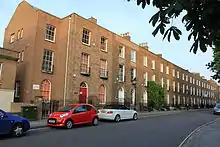On the eastern side of The Crescent, a Georgian terrace was erected in 1807. Built of "pinkish-brown" brick, each house is of three-storeys plus a basement, and is two windows across. The houses are split by plain pilasters and topped with hipped slate roofs. While the first and second storey windows are rectangular, those on the ground floor are round-headed, as are the doorways. The first floor windows have small, circular segmental balconies. A variety of six- and eight-panel doors are reached by climbing a small flight of steps, and the entire terrace is fronted with railings. This terrace forms two separate listed building designations from Historic England; numbers 1–11 and 15–20, both of which are Grade II* listed.[15][16]