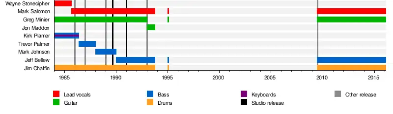 In late 1984, drummer Jim Chaffin, guitarist Greg Minier, bassist Kirk Palmer, and vocalist Wayne Stonecipher started a band named K.G.B. in Fresno, California[4][5] The four teens knew each other as high school classmates. The name K.G.B. had no meaning to it, the members just thought initials "sounded cool".[6] In early 1985, K.G.B. was looking for a new vocalist due to the departure of Stonecipher. Minier asked his friend Mark Salomon to try out as vocalist.