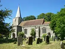 Other locations in Pluckley village itself were used extensively; the Black Horse pub in The Street was renamed the Hare and Hounds and used as the Larkins' local. Church Gate Cottage and Fig Tree Cottage in The Street served as Edith Pilchester's and The Brigadier's homes, respectively. Pluckley primary school, also in The Street, served as the village hall. The butcher's shop also featured, and the Post Office (dressed as the grocer's). Church scenes were filmed at St Nicholas Church in the village.[6]