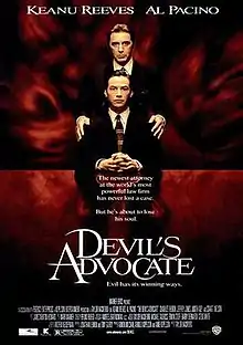 The Devil's Advocate (marketed as Devil's Advocate) is a 1997 American supernatural horror film directed by Taylor Hackford, written by Jonathan Lemkin and Tony Gilroy, and starring Keanu Reeves, Al Pacino, and Charlize Theron. Based on Andrew Neiderman's 1990 novel of the same name, it is about a gifted young Florida lawyer (Reeves) invited to New York City to work for a major firm. As his wife (Theron) becomes haunted by frightening visions, the lawyer slowly begins to realize the owner of the firm (Pacino) is not what he appears to be, and is in fact the Devil.