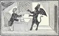 Professor Eric C. Brown judges the climax, in which Milton attempts to persuade Lomax to have sex with his half-sister to conceive the Antichrist, to be the most "Miltonic", as the sculptures become animated in carnal activities evoking Paradise Lost's "Downfall of the Rebel Angels".[7] The tirade Milton gives in this sequence is at times also reminiscent of Satan's lines in Paradise Lost Books I and II.[10] In U.S. literary education, Milton's temptation of Lomax in the climax, in which he rationalizes rebellion against God for a "Look, but don't touch" model, has been compared to Satan urging Eve to eat forbidden fruit in Paradise Lost, Book IX, lines 720–730:[11]