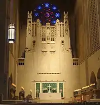 A number of churches and courts hosted production. The interior of New York City's Church of the Heavenly Rest was used for the scene where Theron's character says Milton raped her.[29][39] The outside of Central Presbyterian Church was photographed for Barzoon's funeral, while Pacino was inside the Manhattan Church of the Most Holy Redeemer for the holy water sequence.[39] For court scenes, New Jersey's Bergen County Court House was employed for production,[40] as were historic courthouses in New York.[41]