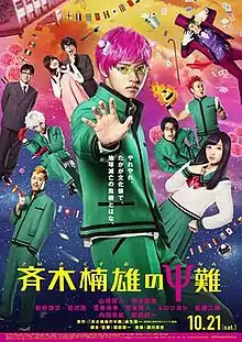The Disastrous Life of Saiki K. (Japanese: 斉木楠雄のΨ難, Hepburn: Saiki Kusuo no Sai-nan) is a 2017 Japanese science fiction comedy film and an adaptation of the manga series by Shūichi Asō, directed by Yuichi Fukuda.[2] Starring Kento Yamazaki, Ryo Yoshizawa and Kanna Hashimoto at Columbia Pictures (Sony Pictures Entertainment Japan) and Asmik Ace, the film was released on October 21, 2017.[3] A visual for this film was unveiled on Friday, May 20, 2017, revealing Kusuo's parents.[4]