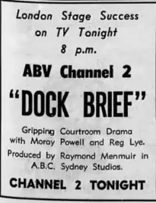 - ↑ ""Dock Brief" Telecast from ABN". Sydney Morning Herald. 28 January 1960. p. 5.