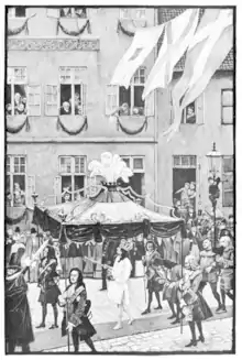 Andersen's tale is based on a 1335 story from the Libro de los ejemplos (or El Conde Lucanor),[2] a medieval Spanish collection of fifty-one cautionary tales with various sources such as Aesop and other classical writers and Persian folktales, by Juan Manuel, Prince of Villena (1282–1348). Andersen did not know the Spanish original but read the tale in a German translation titled "So ist der Lauf der Welt" ("That's the way of the world").[3] In the source tale, a king is hoodwinked by weavers who claim to make a suit of clothes invisible to any man not the son of his presumed father; whereas Andersen altered the source tale to direct the focus on courtly pride and intellectual vanity rather than adulterous paternity.[4][5]
