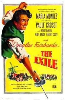The Exile is a 1947 American historical adventure romantic film directed by Max Ophüls,[2] and produced, written by, and starring Douglas Fairbanks Jr. French actress Rita Corday (billed as "Paule Croset") played the romantic interest. According to Robert Osborne, the primary host of Turner Classic Movies, María Montez had a stipulation in her contract that she had to have top billing in any film in which she appeared, so her name comes first in the opening credits, despite her secondary role. The film is based on the 1926 novel His Majesty, the King: A Romantic Love Chase of the Seventeenth Century by Cosmo Hamilton.